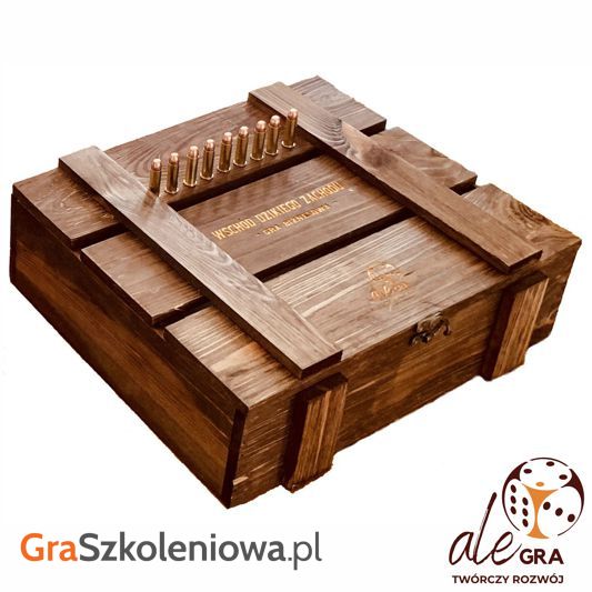 - Komplet pomocy do realizacji gry zapakowany w efektowną drewnianą skrzynię (karty, banknoty, maty do gry i inne elementy).